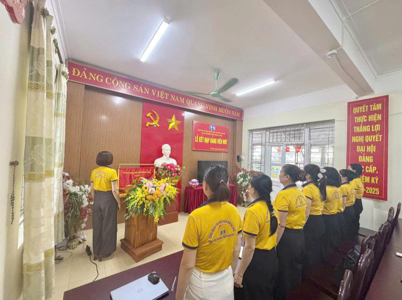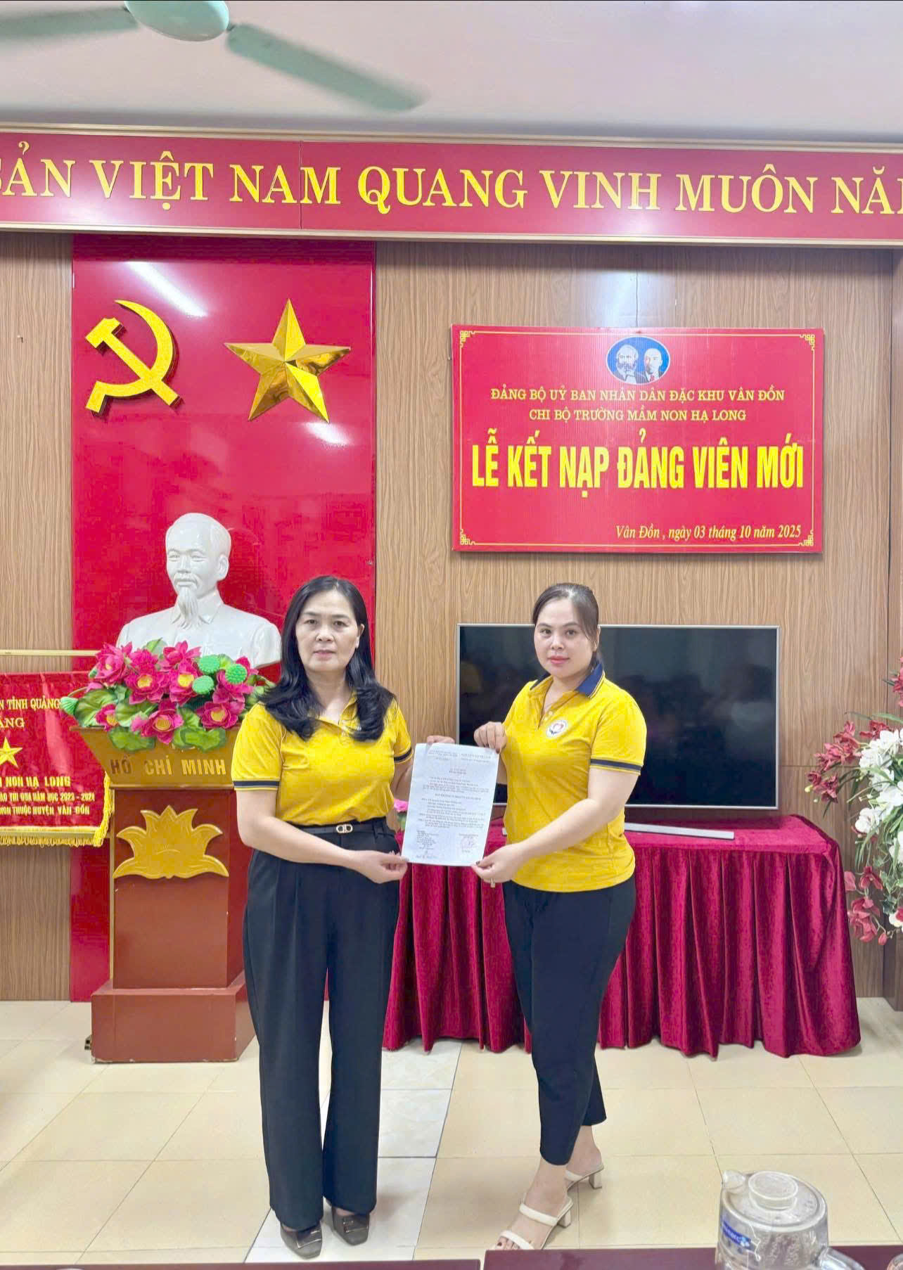 👉☘️🍀⭐️ Bồi dưỡng kết nạp đảng viên mới là nhiệm vụ thường xuyên có ý nghĩa quan trọng trong công tác xây dựng đảng góp phần phát triển nâng cao chất lượng và sức chiến đấu của tổ chức cơ sở đảng nói chung và cá nhân đảng viên nói riêng. 👉Căn cứ vào điều lệ Đảng Cộng sản Việt Nam xét đơn xin vào đảng của quần chúng ưu tú Phạm Thị Kim Anh; Hà Thị Thu. Chiều ngày 03 tháng 10 năm 2025 chi bộ trường mầm non Hạ Long đã tổ chức kết nạp đảng cho quần chúng ưu tú Phạm Thị Kim Anh; Hà Thị Thu giáo viên trường mầm non Hạ Long vào Đảng Cộng sản Việt Nam. ☘️ Đến dự buổi lễ kết nạp đảng viên có đồng chí Đồng chí Phạm Thị Thanh Tâm bí thư chi bộ, HT nhà trường cùng toàn thể các đồng chí đảng viên trong chi bộ. 💐Lễ kết nạp đảng viên mới được diễn ra trong không khí trang nghiêm đúng trình tự thủ tục của điều lệ đảng đồng chí Phạm Thị Thanh Tâm bí thư chi bộ lên đọc quyết định kết nạp đảng cho đồng chí Hà Thị Thu; Phạm Thị Kim Anh. ☘️Đồng chí Phạm Thị Thanh Tâm bí thư CB trao quyết định kết nạp đảng cho đồng chí Phạm Thị Kim Anh; Hà Thị Thu. Đồng thời quán triệt nhiệm vụ quyền hạn của người đảng viên nhiệm vụ của chi bộ phân công đảng viên chính thức giúp đỡ 02 đồng chí trong thời gian đảng viên dự bị. 👉 Sau thời gian làm việc khẩn trương buổi lễ kết nạp đảng viên mới đã thành công tốt đẹp; Sau buổi lễ kết nạp Đảng viên mới Chi bộ tiến hành sinh hoạt chi bộ thường kỳ tháng 10/2025. 👇🏻Sau đây là một số hình ảnh của Lễ Kết nạp ĐV mới: